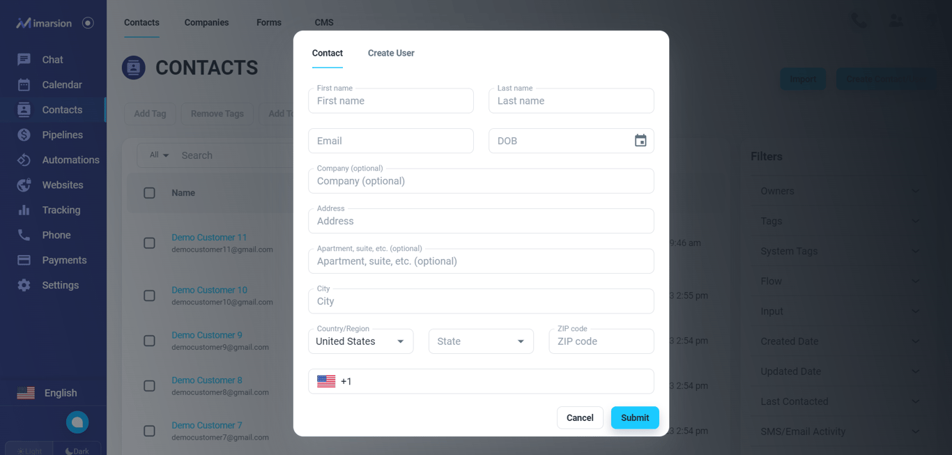 Please, create a contact for the user if you don’t have that already. Please, click on the ‘Database’ menu on the left menu bar. Once the page is loaded, click on the ‘Create Contact/User’ button.